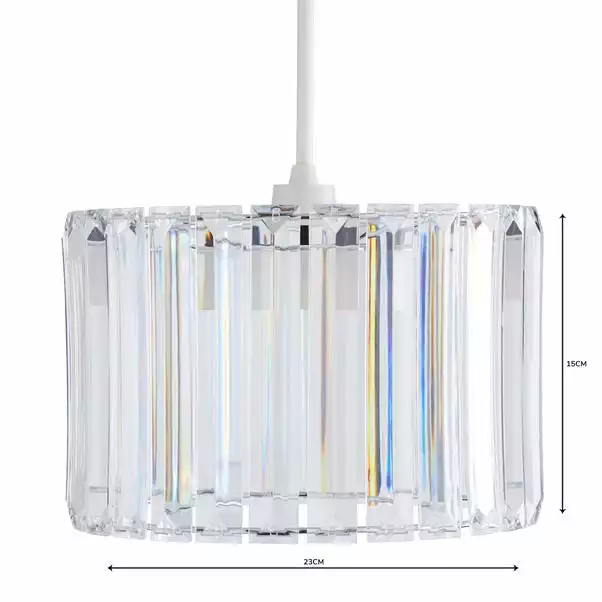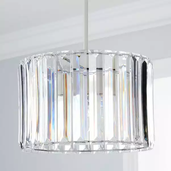 Detailed with vertical strips of sparkling acrylic prisms, this circular silver ceiling pendant will add a glamorous feel to any interior space.