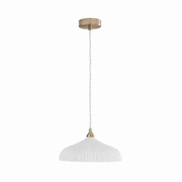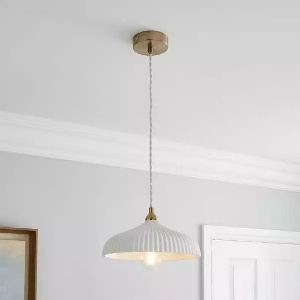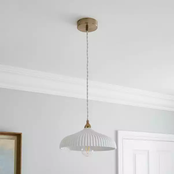 Featuring a luxe look, the Dorma Ribbed Porcelain Ceiling Fitting has been crafted with a plated ceiling cup and a stunning ribbed metal shade. This ceiling fitting requires 1 x GLS ES (E27) – 6W LED which is not included with the light. With an adjustable drop, this ceiling light can be placed at your desired height and is dimmable compatible with a suitable bulb and light switch. A 5-year guarantee is provided with this ceiling light.
