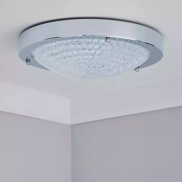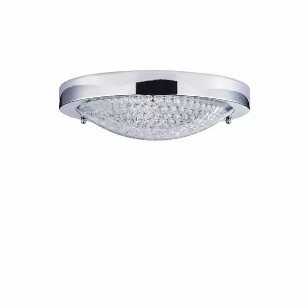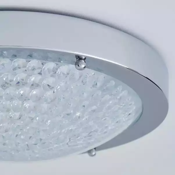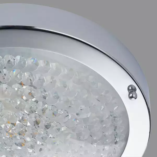 This Neutral and minimalist flush fitting will fit perfectly into any home decor. It features a chrome edge, a jewelled detail surface and has a dimmable feature so you can adjust the lighting to suit your needs.