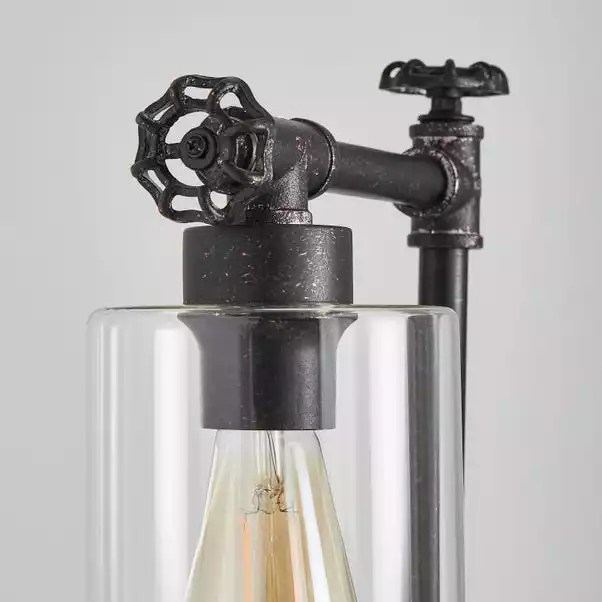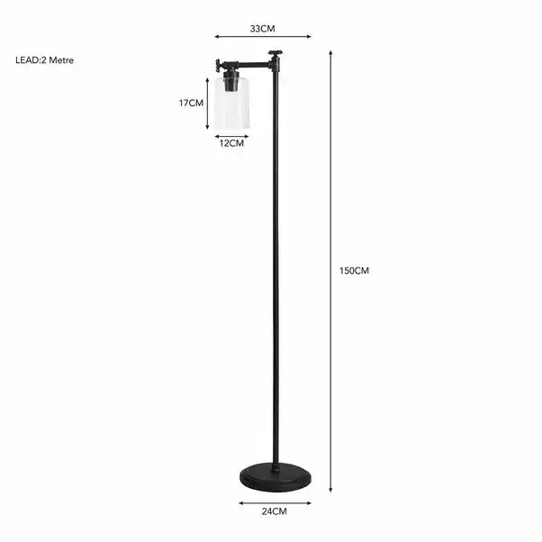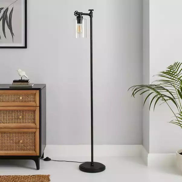 The Bates 1 Light Industrial Floor Lamp is perfect for adding a contemporary industrial feel to your room. Beautifully designed with a distressed black metal industrial style frame with decorative wheel details, paired with a clear cylindrical glass shade. This floor lamp is dimmable compatible with a suitable bulb and dimmer switch. Pair this piece with matching family items from the Bates range.