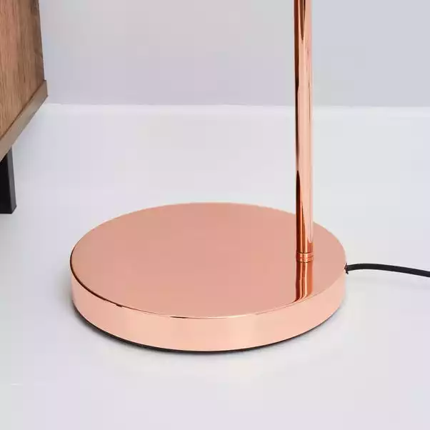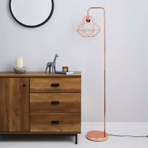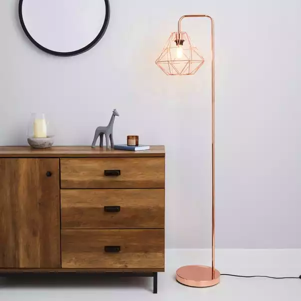 Add a contemporary element to your home décor with this stunning floor lamp, featuring a geometric frame head with an inline floor switch, length 100cm,and completed with a smooth copper finish.