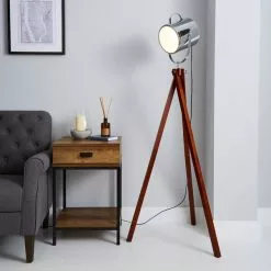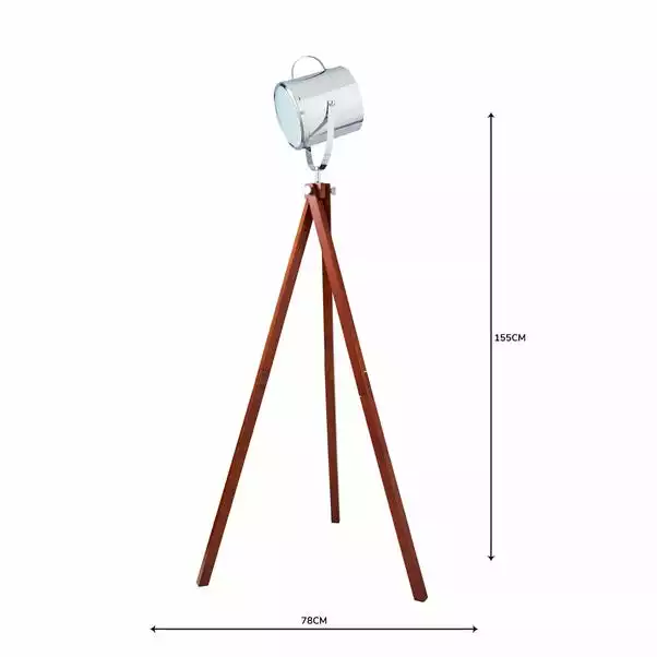 Crafted with a standing tripod design and traditional chrome and wood finish, our modern wooden camera floor light is supplied with a two-metre cable.