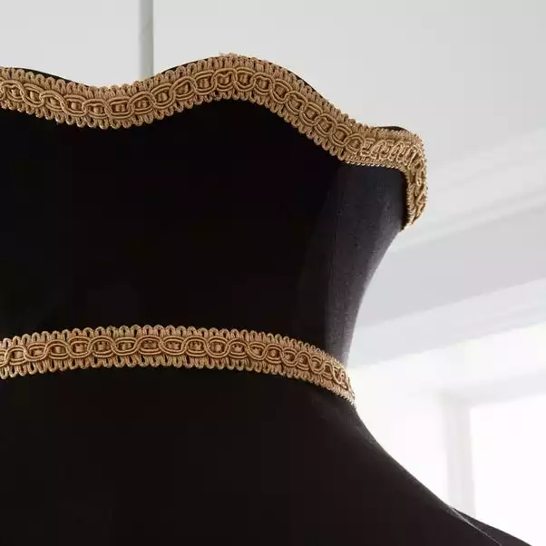 This beautiful Victoria shade would be a perfect feature to any room. It features a scalloped edge, a delicate gold trim, a traditional shape and a tassled fringe presented in a black and gold colourway.