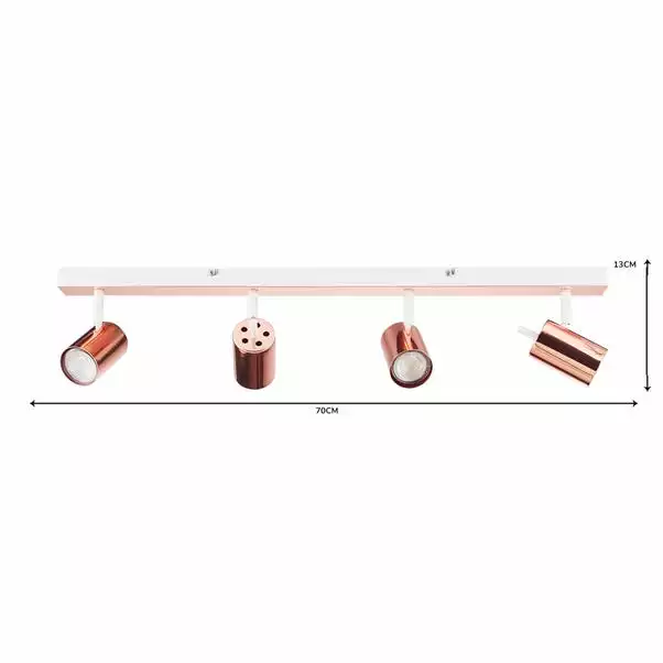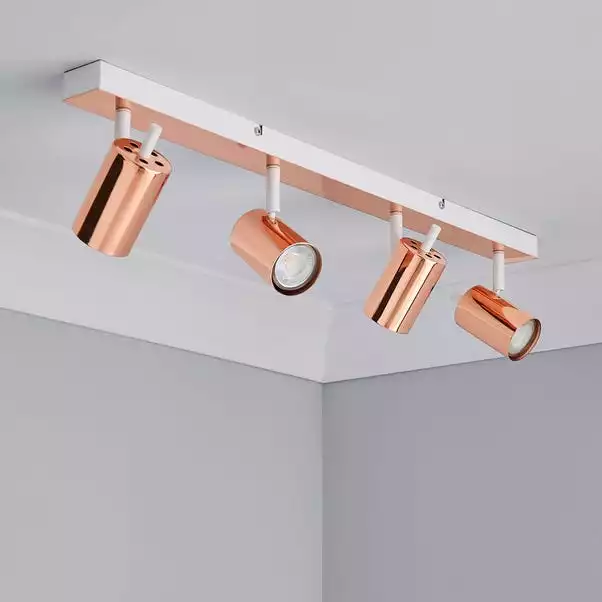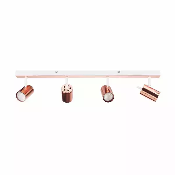 Featuring a bar with four adjustable and dimmable lights, this contemporary LED spotlight is crafted with an on-trend, modern finishes in an elegant copper plated and a painted matt white.
