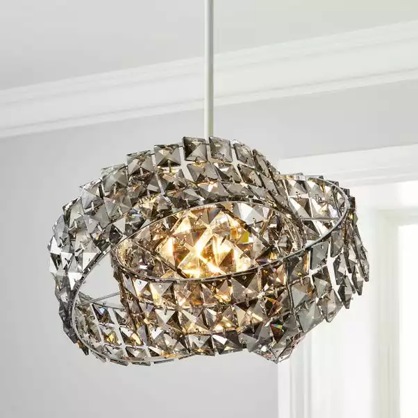 Make a bold statement in your room with this luxurious Cecille easy fit pendant, crafted with real glass crystals and a contemporary chrome finish. The Cecilie is unique in design with three rings that are intertwined around each other, this easy to fit pendant will instantly add a glamorous touch any home décor. This stunning pendant is available in a choice of clear, smoke & champagne crystals.