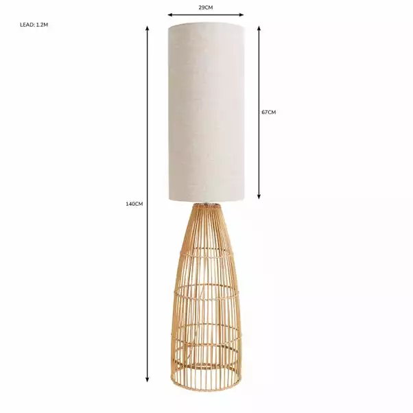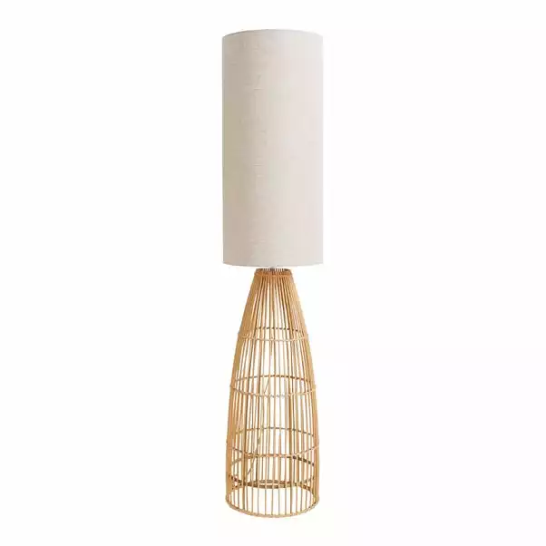 Add a unique touch to your home décor with this stunning Cortado Floor Lamp, featuring a curved wicker base with a tall textured shade and a foot switch. A perfect way to enhance your home décor with a contemporary and stylish touch.