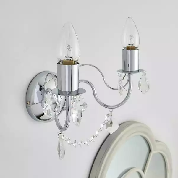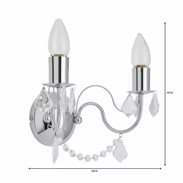 This Elizabeth dimmable wall light features a stylish chrome finish, draped in faceted glass droplets, perfect for adding a touch of glamour to your home.