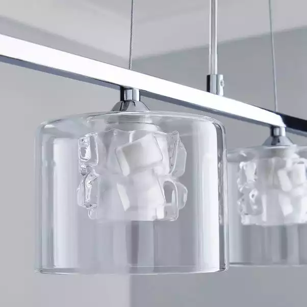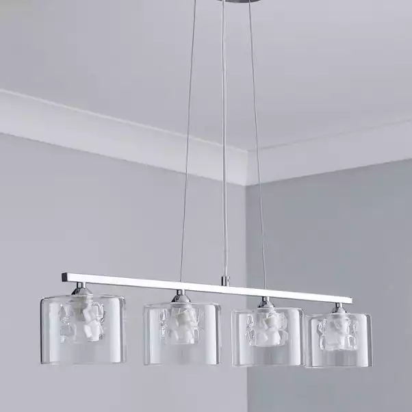 Add a modern and contemporary touch to your home with this elegantly designed fitting. It features four dual layer glass shades, attached to a chrome metal bar and suspended from three height adjustable fabric ropes with a clear flex in the centre. This piece is finished with a beautiful chrome metal base. With its stylish and elegant design, the Erie 4 light would make a stunning addition above a dining table or kitchen island.