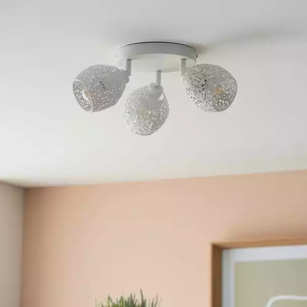 Add a feminine touch to your home with this gorgeous Fearne 3 Light Spotlight, beautifully designed with a matt white paint metal base and 3 spotlights with dainty patterned detail shades. This spotlight will look beautiful in any room and you can even coordinate your home with matching family items. Dimmable compatible with a suitable light switch and bulb.