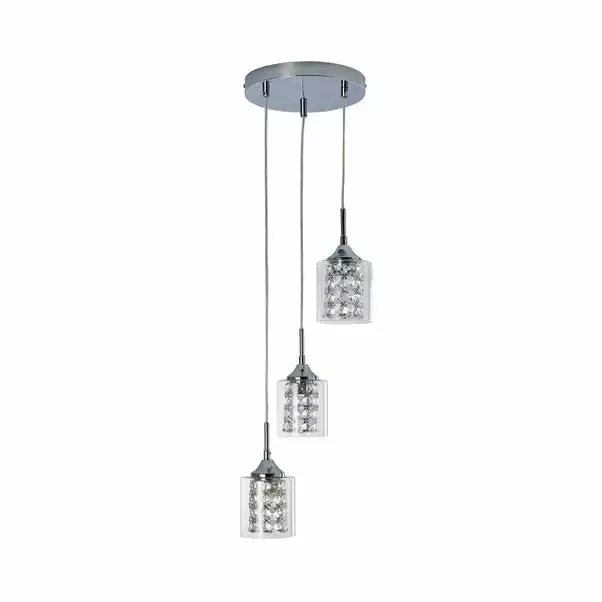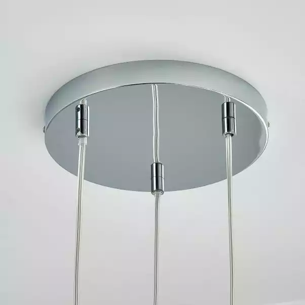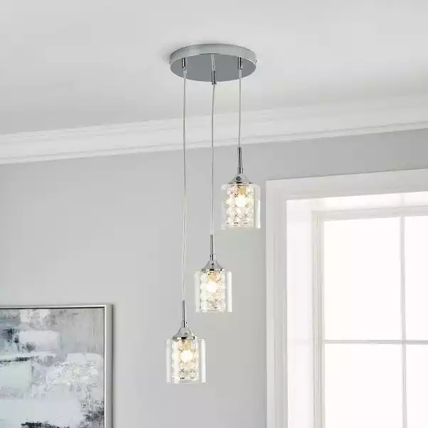 Add a luxurious look to your décor with the Frankie 3 Light Cluster Ceiling Fitting, beautifully designed with a chrome base and three crystal shades enclosed within clear glass shades. This contemporary style light features 3 height adjustable clear flex cables, allowing you to collapse or extend the shades to create a unique look to better suit your space. Matching family items available to help coordinate your home.
