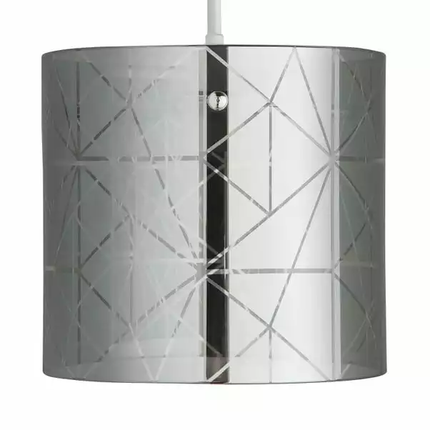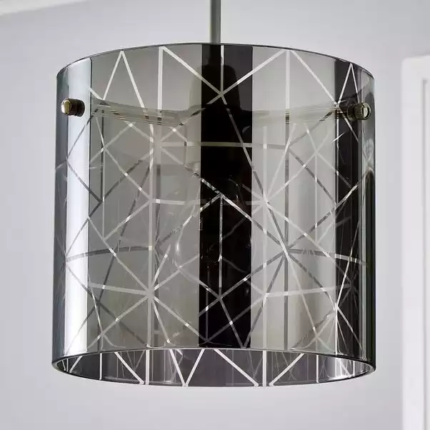 The Grayson Large Easy Fit Pendant is crafted from a stylish smoked glass, featuring a modern cylindrical design that would add a contemporary touch to any room. This modern glass shade also features chrome metal details and a stylish frosted etched finish, perfect for adding a luxurious touch to your room.