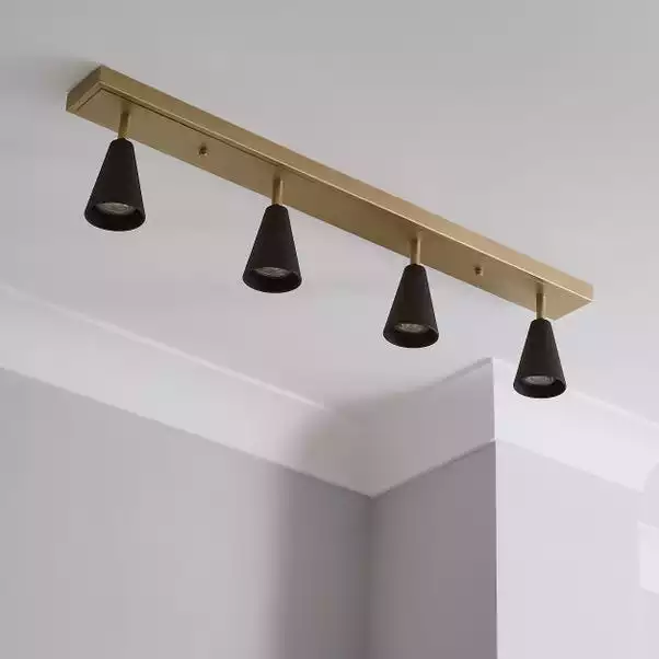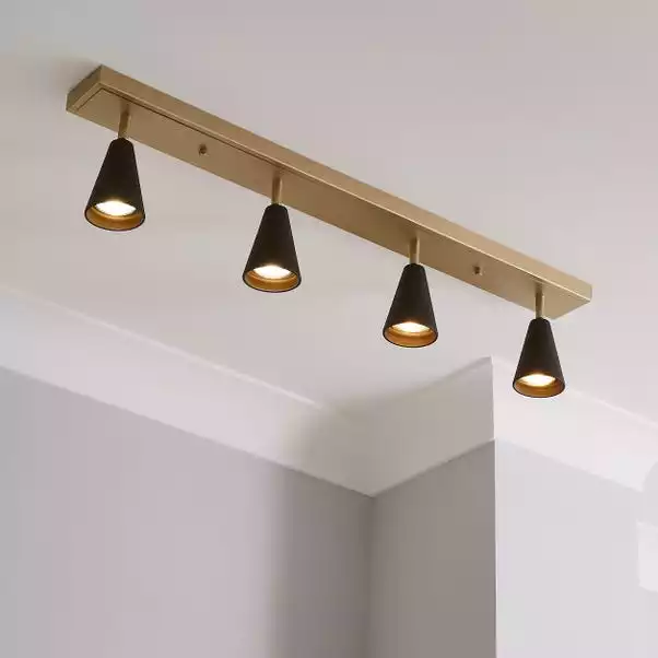 Pairing a satin gold effect finish with contrasting textured dark grey shades, the Grove 4 light spotlight bar fitting would be perfect for the stylish, modern home and features adjustable shades. Perfect for lighting your bar or dining area, this understated, contemporary fitting is fully compatible with dimmer switches, with matching items available, ideal for creating a coordinated look.
