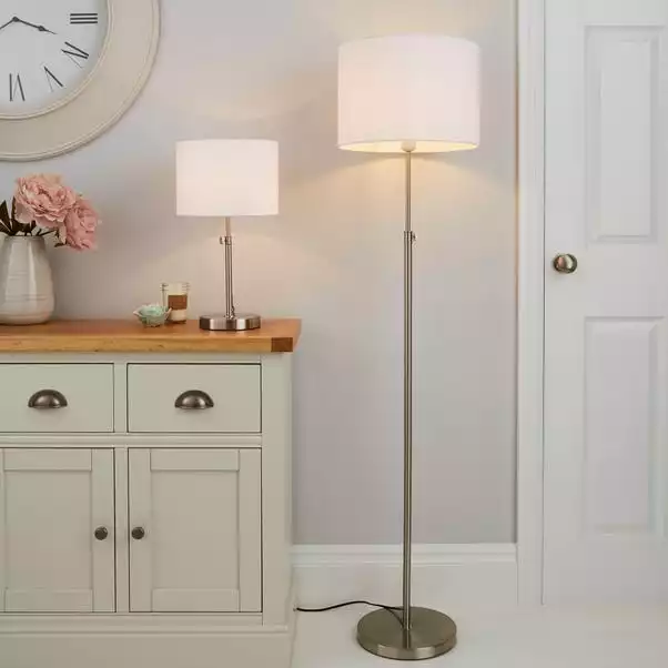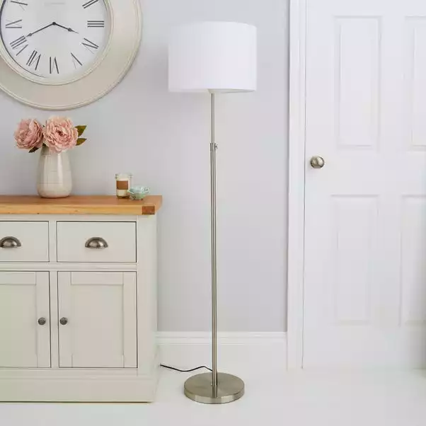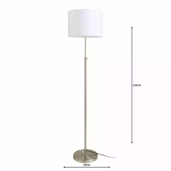 Introduce a beautiful and chic element to your home décor with the Hemming Extendable Floor Lamp, featuring a solid durable steel base with a smooth chrome finish. The design of the crisp white pongee shade adds a modern touch to your home décor.