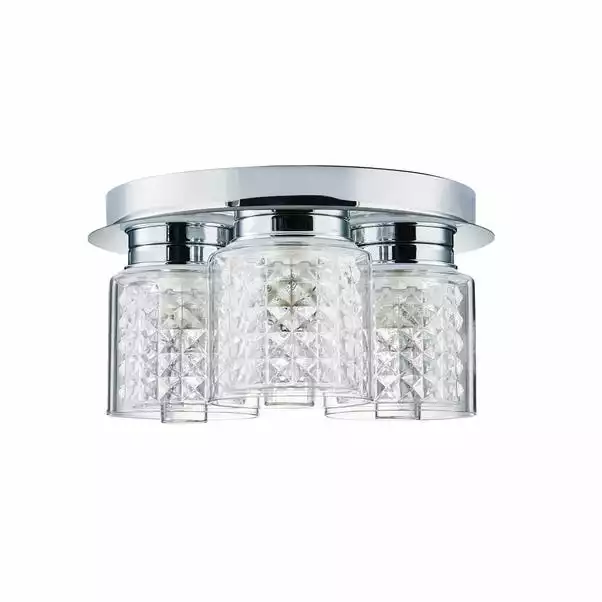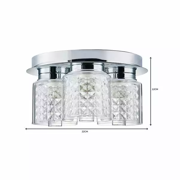 Add a touch of style to your bathroom with this chrome finished ceiling light. Made with durable materials, this flush light features three decorative glass shades and dimmable option.