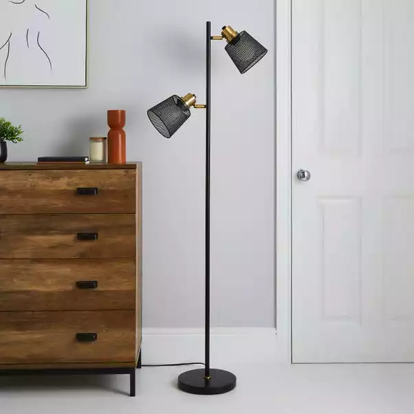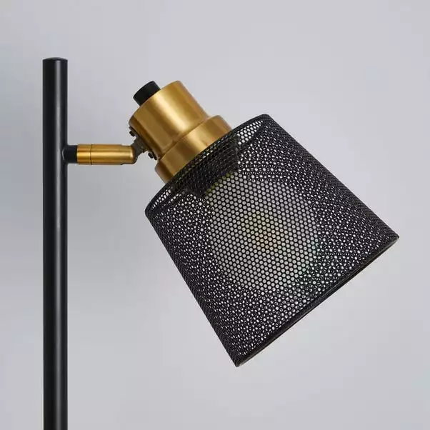 Offering a gorgeous modern style, the Idris floor lamp is finished in a contemporary matt black finish with contrasting antique brass features for an industrial look. Perfect for any living space, this fitting features two adjustable fixtures at varying heights with metal mesh shades.