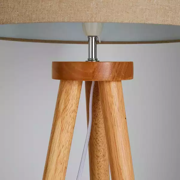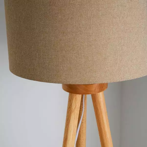 Add a modern, retro feel to your home with this tripod floor lamp. Designed with a simple, chunky leg look, this lamp has a natural varnished wood and a natural beige shade, suitable for a variety of living spaces.