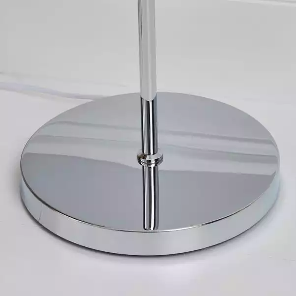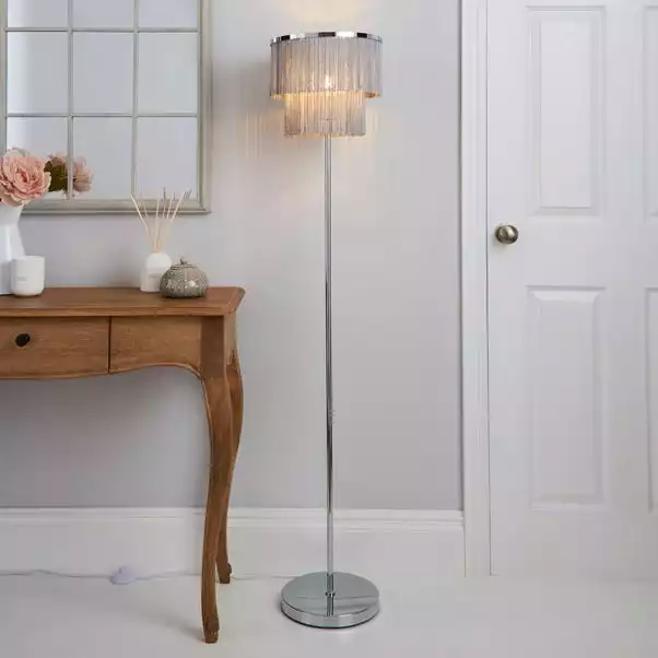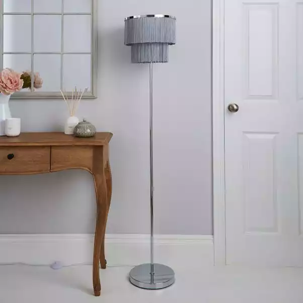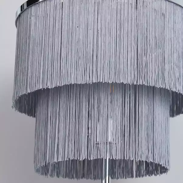 This Jaz floor lamp features a two tier tassel fringe shade with an inline floor switch, a cable length of 100cm and completed with a smooth chrome finish.