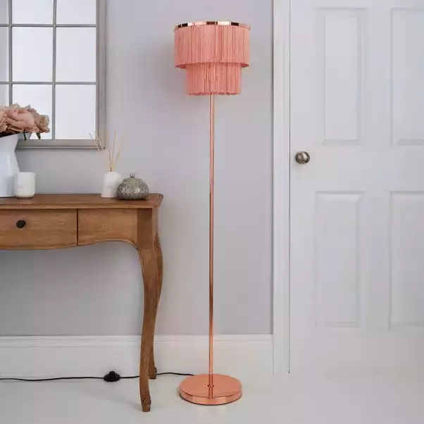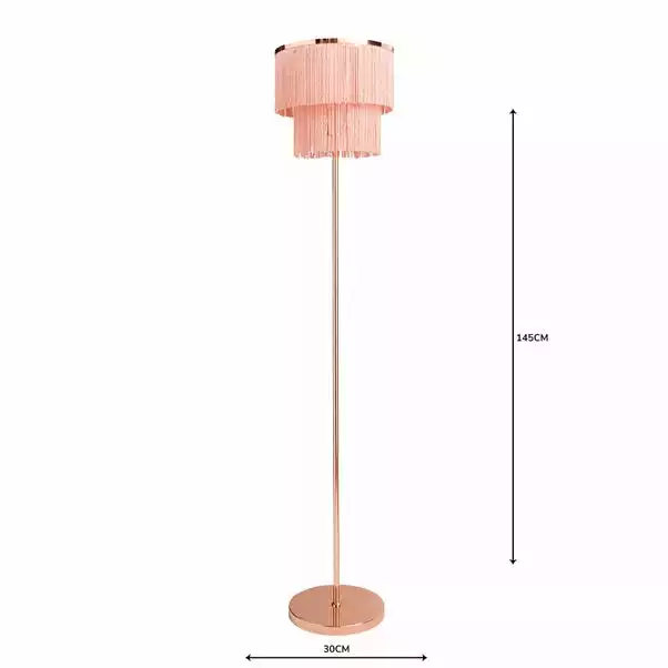 This Jaz floor lamp features a two tier tassel fringe shade with an inline floor switch, a cable length of 100cm and completed with a smooth chrome finish.