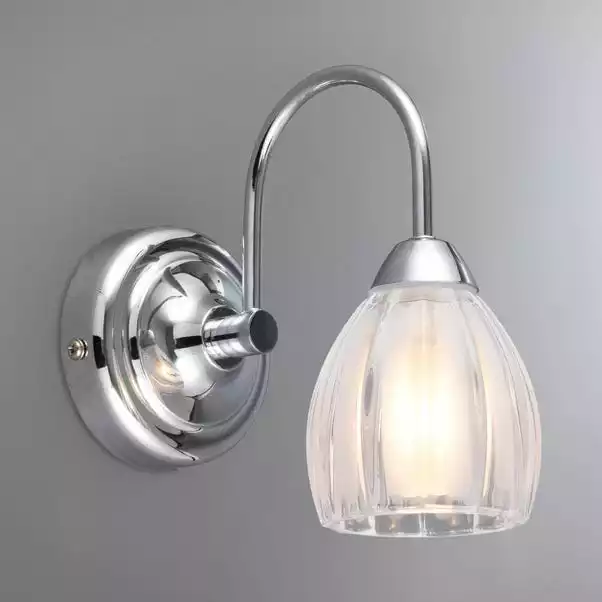 Designed with a single LED light that is dimmable this bathroom wall light features a ribbed and frosted glass shade that beautifully diffuses the light in your bathroom and is finished with a decorative chrome base.