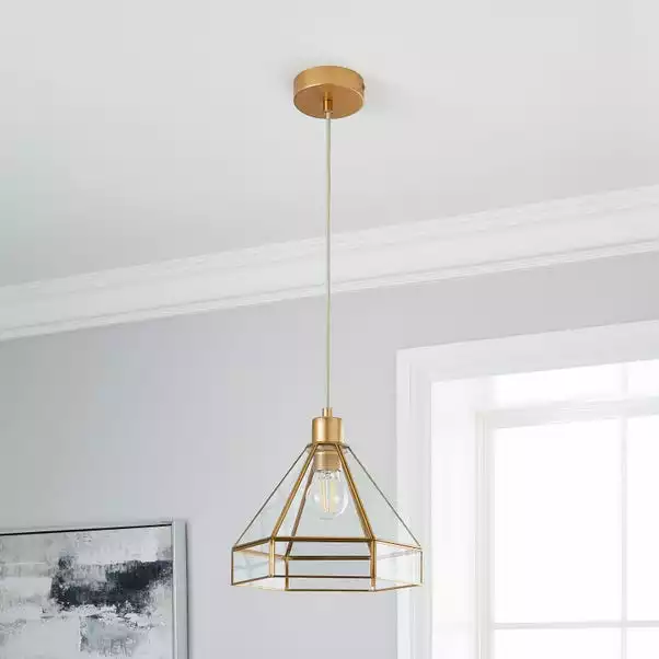 Featuring the stunning Katja 1 Light Pendant Ceiling Fitting, crafted with a satin brushed gold finish base and a clear glass paneled shade detailed with satin brushed gold edges. This luxurious light fitting has a height adjustable fabric cable and is dimmable compatible with a suitable bulb and light switch. Making this a practical and attractive piece for your home.