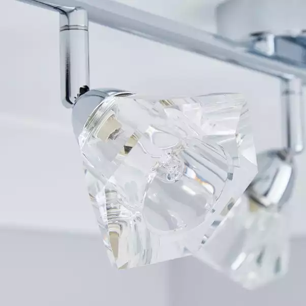 Designed with cut glass shades in the shape of diamonds this spotlight features 3 lights that have adjustable heads that can be used with low energy bulbs for efficiency while the frame is completed with a chrome finish.