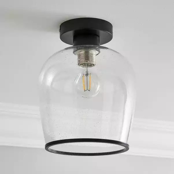 The Lenny Flush Ceiling Fitting has been beautifully designed with bubbled glass and a modern black trim for a contemporary appearance. The Lenny Flush Fitting Light is the perfect piece for adding a classic look to your home with a modern twist. Perfect for lighting hallways or any other room in your home. This piece is dimmable compatible with matching items available, making it easy to create a coordinated look in any room.