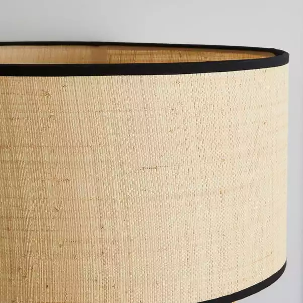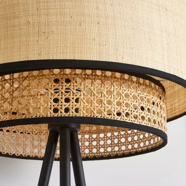 Introducing the stunning Malika Cane 2 Tier Tripod Floor Lamp, featuring a natural coloured shade weaved in raffia and cane material and a black trim for a detailed finish, complete with a Black metal tripod design base for a stylish appearance. The perfect floor lamp for any modern and traditional home.