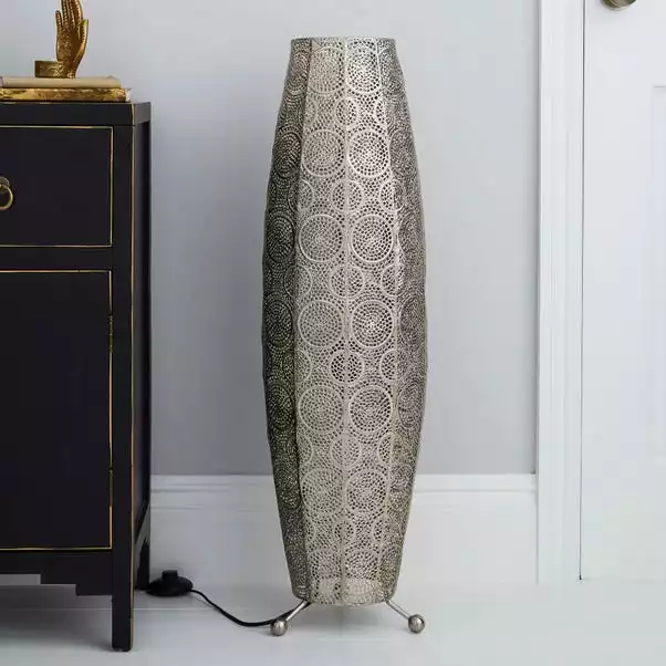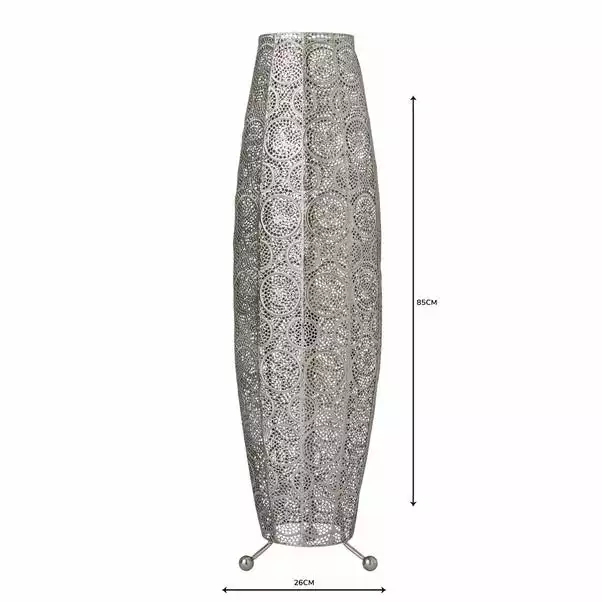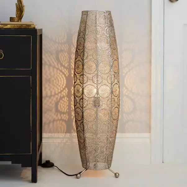 This unique Moroccan inspired floor lamp features a detailed cut out design with a rich Chrome finish, place this lamp in your living space for a beautiful traditional element that instantly enhances your home décor.