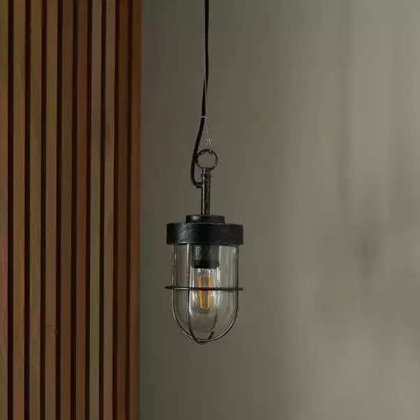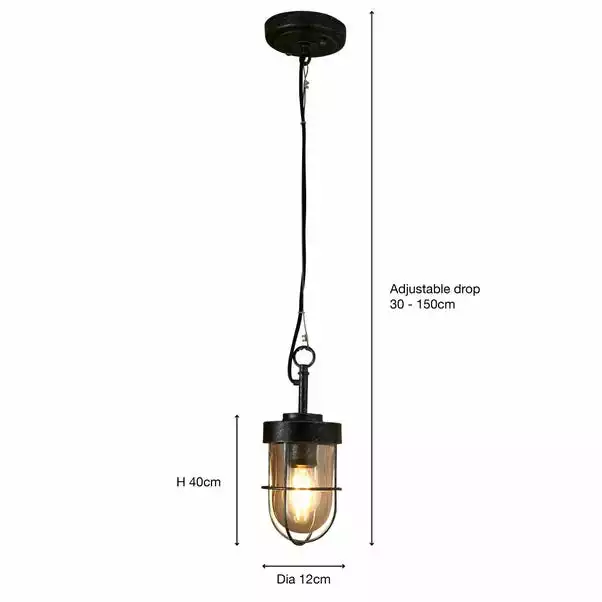 Add a modern contemporary look to your home with the Marine Industrial Ceiling Fitting .This industrial style single pendant is finished in aged pewter paint, and a clear glass shade. Complete with IP44 rating, so its suitable for use in the bathroom. The Marine Ceiling fitting is height adjustable, dimmable with a compatible bulb and light switch, as well as suitable for use with LED lamps. Matching items from the Marine range are available to help coordinate your home.