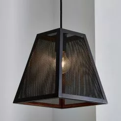 This ceiling light has an industrial black cage surrounding an exposed bulb. This light is adjustable in height and is compatible with a dimmer switch and bulbs.