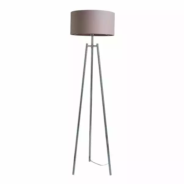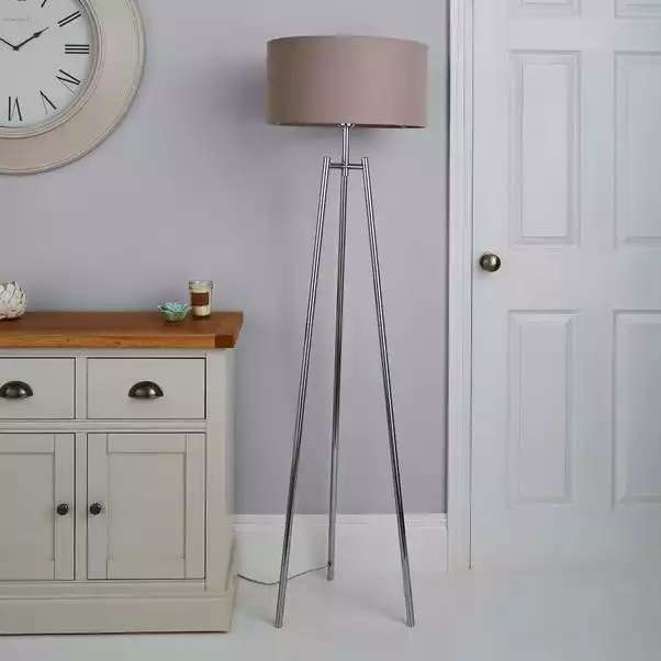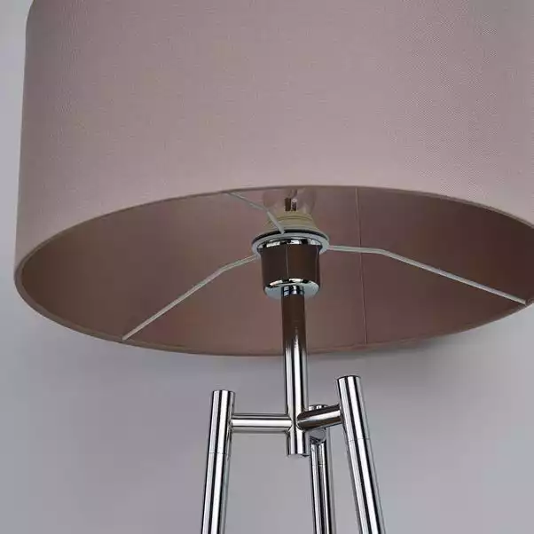This stylish tripod floor lamp comes with a champagne fabric shade and metal legs with a chrome finish.
