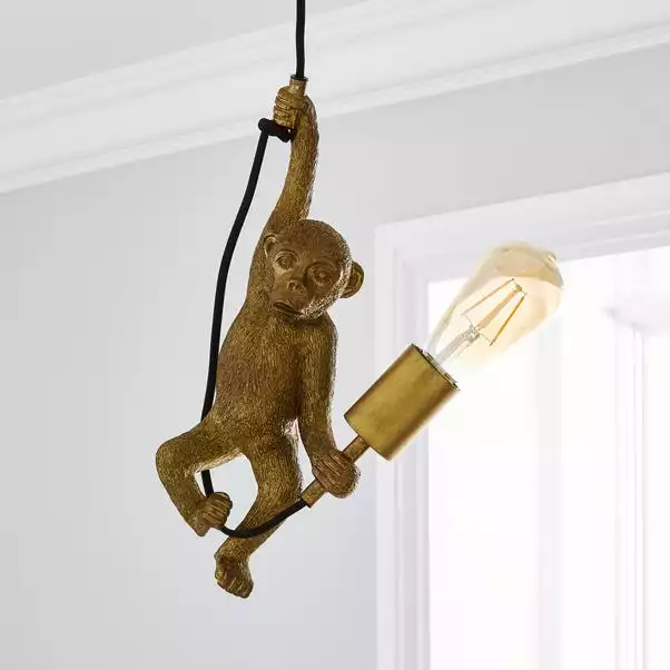Perfect for adding a charming, characterful touch to your home, the Odisha Monkey Ceiling fitting would make a stunning statement piece and would partner perfectly with a decorative exposed bulb. This fitting features a playful resin monkey figurine, finished in a brushed gold colourway, complete with a contrasting black ceiling plate and fabric flex cable. This piece is dimmable compatible, making it both an attractive and practical product.