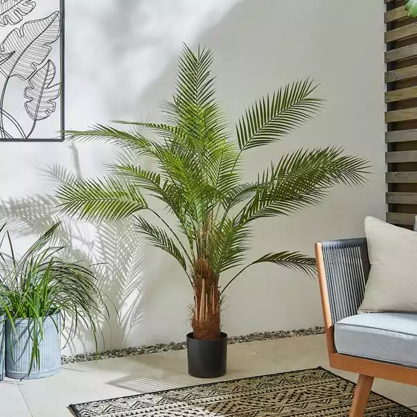 This artificial green palm tree is ideal to brighten up any room. It can be used both indoors and outdoors, so you can place it anywhere you like. It features a standard black plastic pot, but the plant can be put inside a pot of your choice for a unique look.