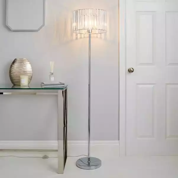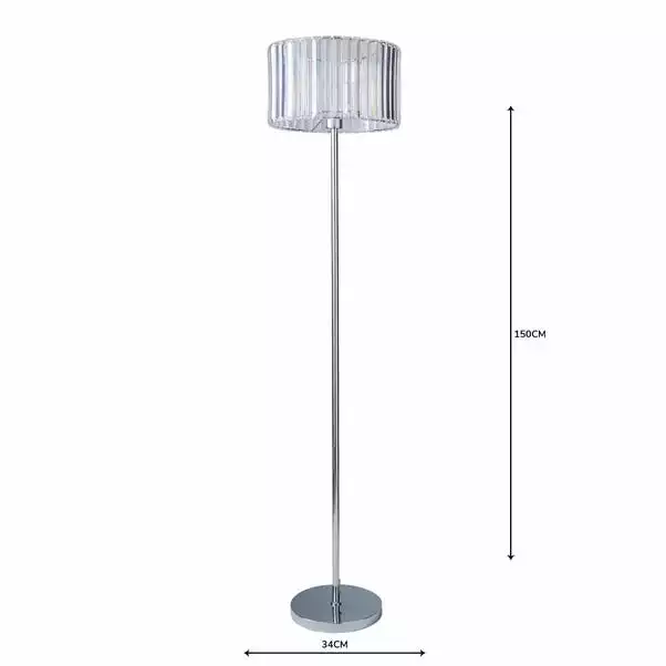 Inject a glamorous touch to your home décor with the Prism Floor Lamp, crafted with a durable steel and Acrylic prism shade and completed with a sleek chrome finish for a modern appearance. This light also comes with a cable length of 150cm.