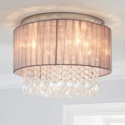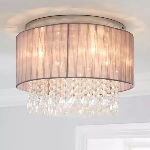 Make a glamorous statement in your home with the beautiful Riah Flush fitting, featuring stunning acrylic bead strings and transparent voile ribbon wrapped shade, crafted with durable steel and completed with a chrome finish for a modern appearance.