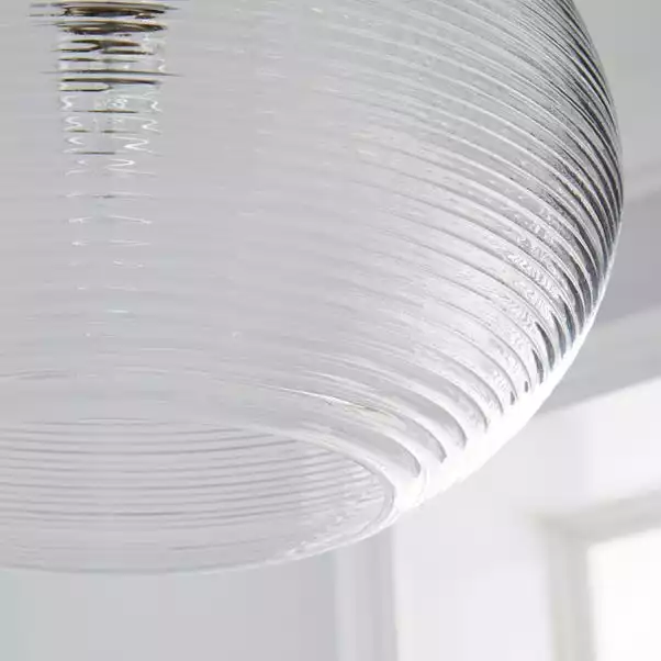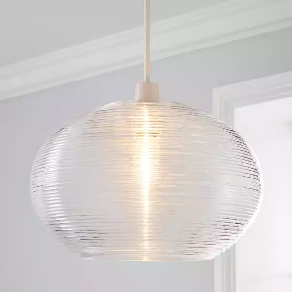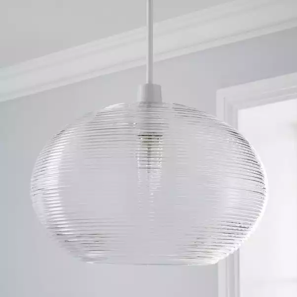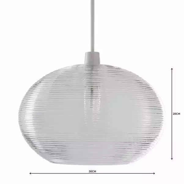 Our Sabrina pendant is made from textured rib transparent glass, which gives it a modern look with an oval shape.