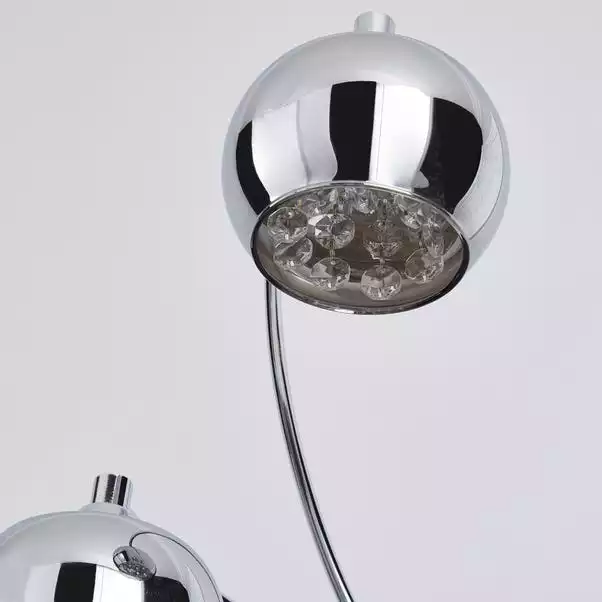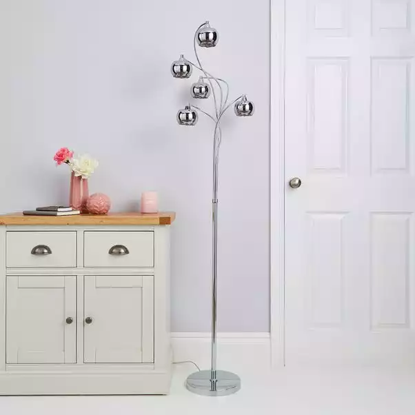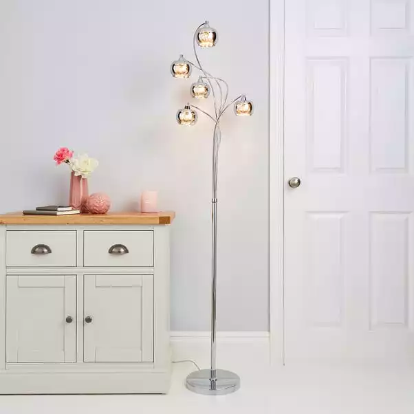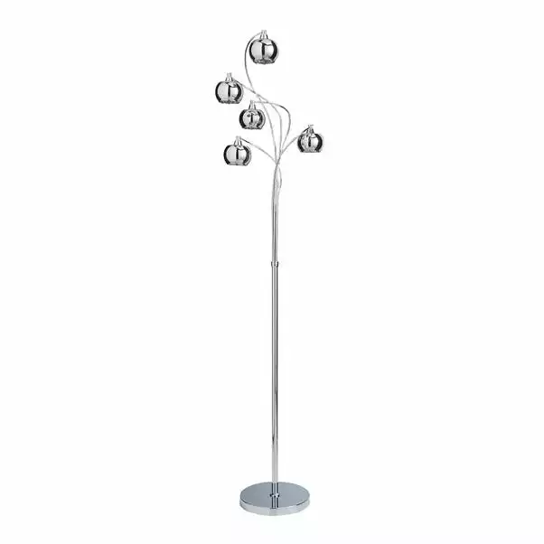 Featuring a sleek chrome finish the elegant Seychelles 5 light floor lamp is designed with rounded glass baubles with decorative clear glass droplets.