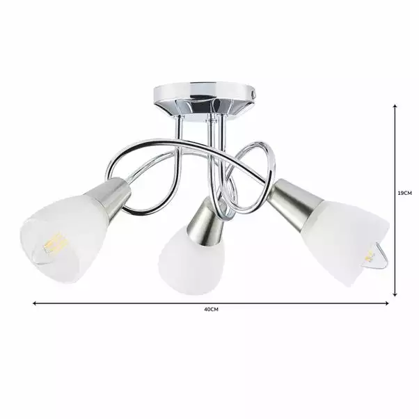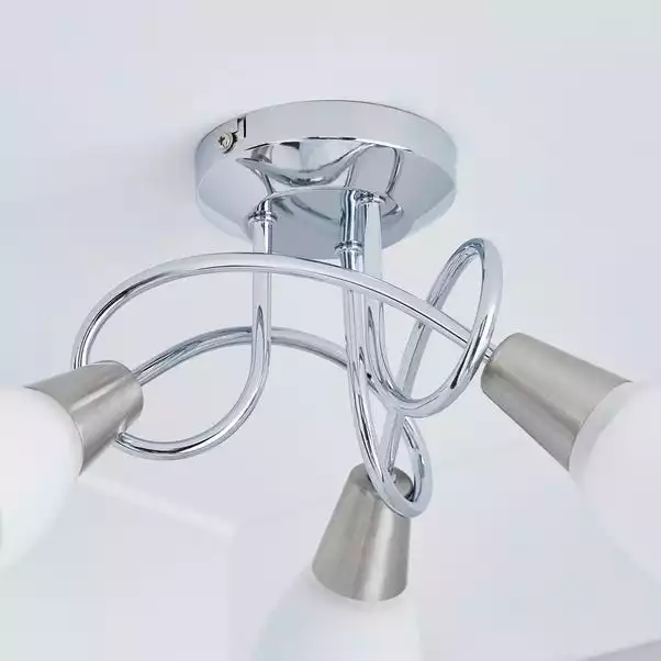 Designed with three swirling interlocked metal arms which hold three light shade fittings, this modern ceiling light features cream coloured glass shades and a chrome finish.