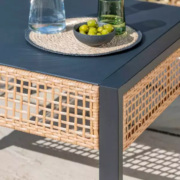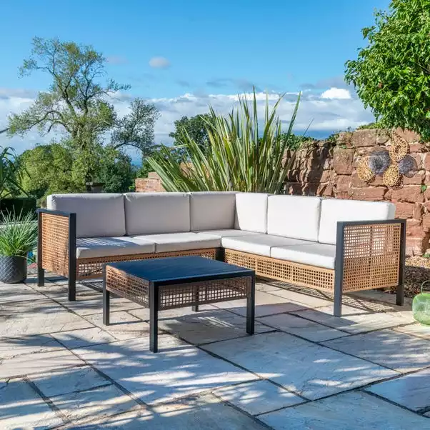 The Sulu Corner Sofa Set features a contemporary design and is perfect for small spaces. Featuring 1 2-seater sofa, 1 corner sofa and 1 table, it’s made from light weight aluminum frames and has a plain black table top that makes it both stylish and functional. The coordinating table also adds a modern touch to the set. The sofa cushions are made from 100% recycled polyester fabric.