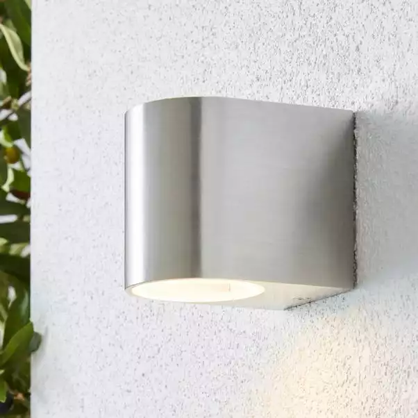 The Tam Outdoor Dimmable Down Lighter, features a simple wall structure and brushed aluminium finish.