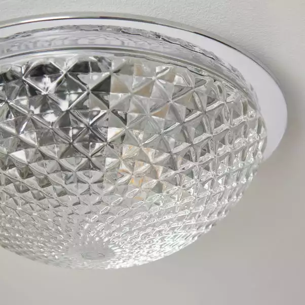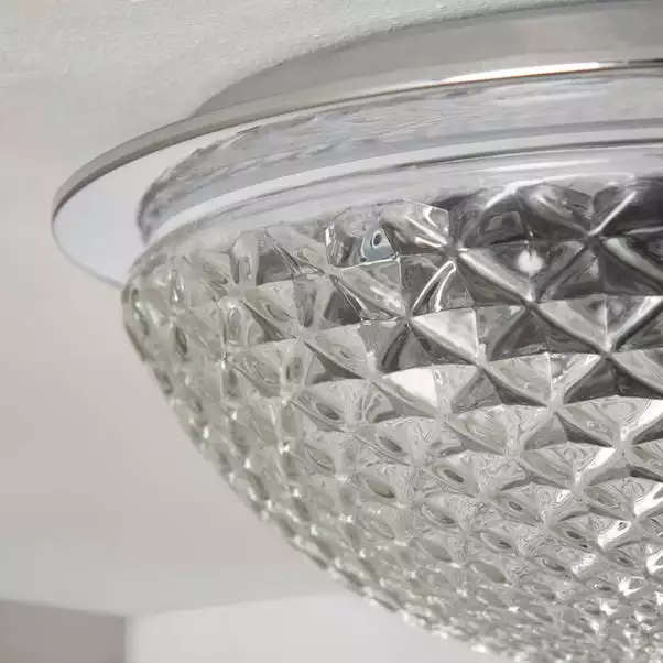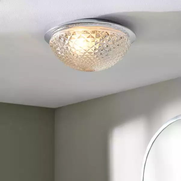 Stylish and luxurious, this light fitting features a stunning faceted dome glass shade, perfect for any room in your home, even your bathroom. Compatible to be dimmed, you can set the perfect ambience whether you’re in a rush for work or simply fancy a relaxing bath after work. This light fitting is available in other colours.