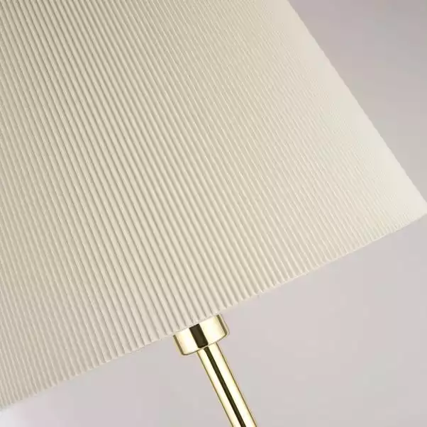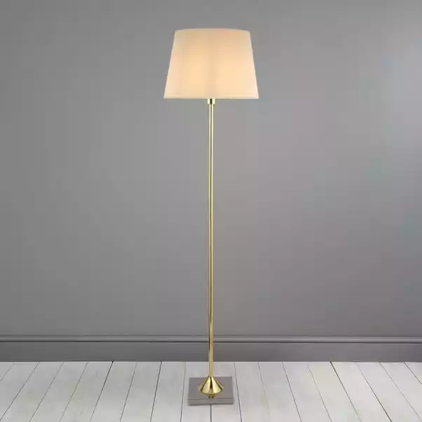 Elegantly crafted to give your decor a glamorous touch, this stunning floor lamp features a simplistic design to brighten up your room. Finished with a brushed gold stand and square chrome base, this floor lamp comes complete with a white pleated shade.