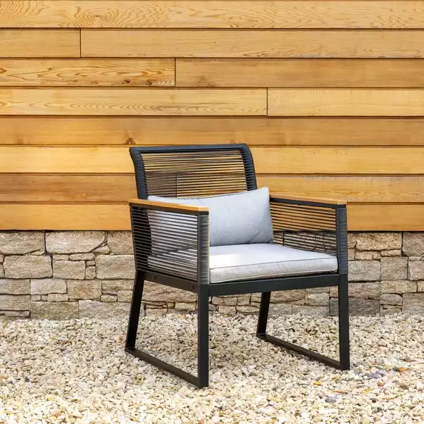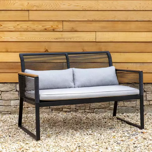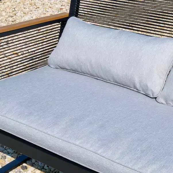 Relax this Summer in style with this Elements 4 Seater Black Rope Conversation Set. With 2 chairs and a double sofa, this set can seat 4 people. This conversation set includes stylish Polywood armrests and a tabletop to add a natural finish that perfectly compliments the modern black metal structure.
