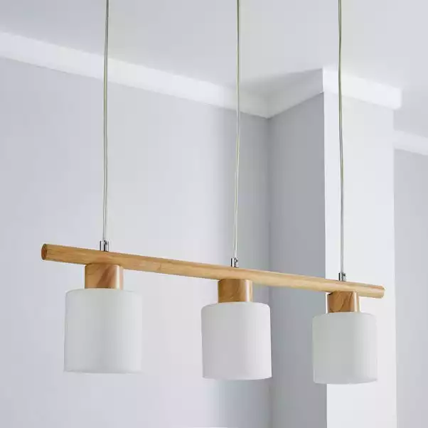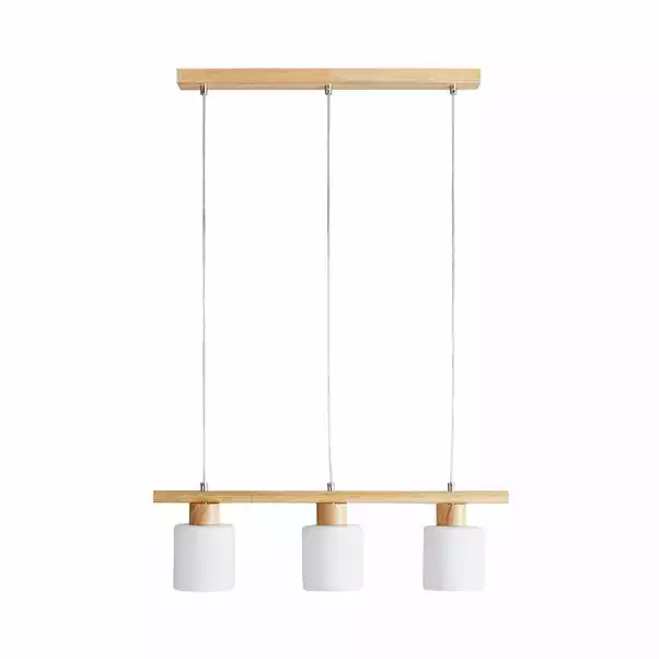 Ideal for adding a modern, natural feel to any space, the Dion Ceiling fitting features a stunning light wood finished hanging bar pendant and would look stunning above a bar or dining table. This contemporary fitting also features white frosted glass shades and clear wire suspension for a subtle, yet stylish finish, and is height adjustable from 30cm to 120cm.