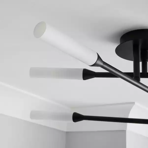 Featuring the Elements Fontain 6 Light Ceiling Fitting, an impressive modern contemporary design with a steel matt black paint effect base paired with matt white glass tube shades. This unique piece is semi-flush, dimmable and impressive in size, perfect for complementing a range of contemporary home décors. Matching family items are available to help coordinate your space.