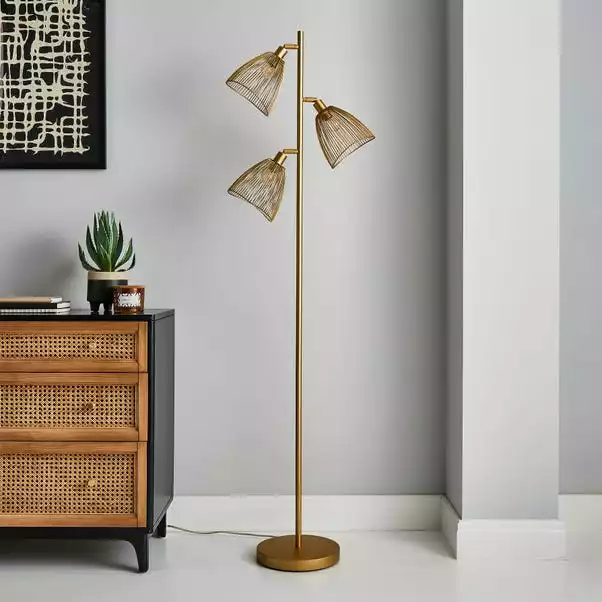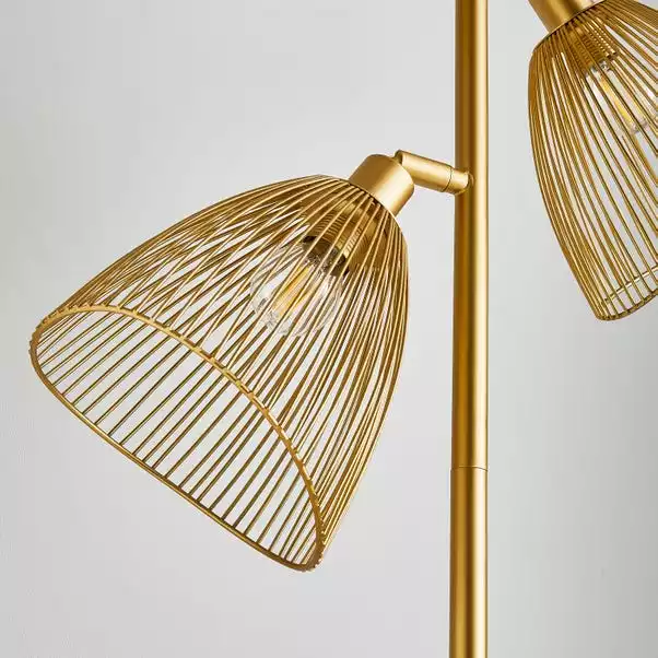 Part of the Elements trend, this stylish Jaula 3 Light Gold Floor lamp has a contemporary design that will complement an array of home decors. Beautifully crafted with a satin gold effect base and straight stem with three adjustable gold metal shades, perfect for adding a modern contemporary touch to any room. Matching family items are available, helping to coordinate your home, to create the dream look.