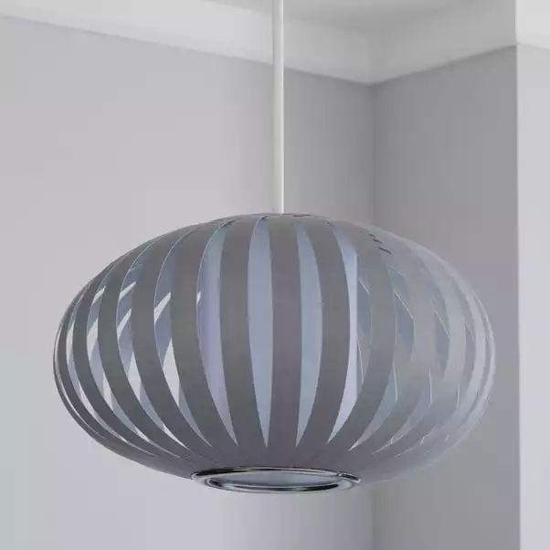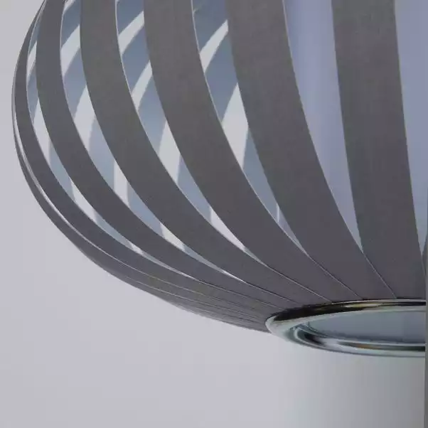 This contemporary grey fabric shade is bound to add a stylish touch to your home. It features an urchin, shaped shade, textured cotton fabric, inner diffuser with chrome top and bottom rings.