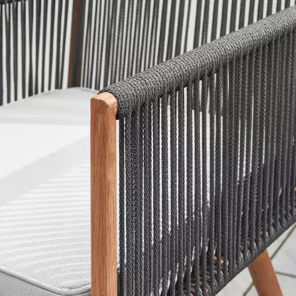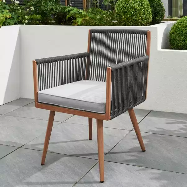 Dine in style this summer with the stunning Elements rope 4 seater dining set, featuring 4 stylish chairs and one dining table with a glass top. Made from light weight and durable aluminum. The chairs are beautifully designed with grey rope and gorgeous tapered legs, complete with padded seat cushions for added comfort and support. This dining set is the perfect addition for any modern garden.