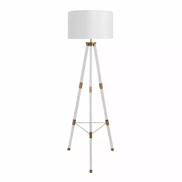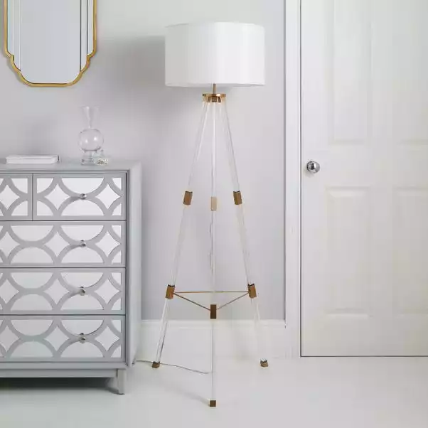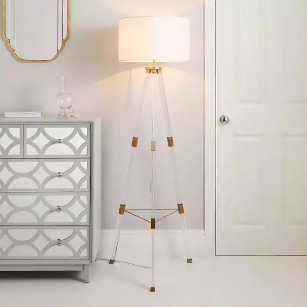 Beautifully crafted, the Hotel Finley Tripod Floor Lamp features a clear acrylic base tripod design, metal detailing and a stunning white fabric shade. A perfect statement lamp to inject a glamorous and luxurious feel to your home interior, this floor lamp will complement an array of home decors. Coordinate your home with matching family items, this piece is available in Gold and Silver.