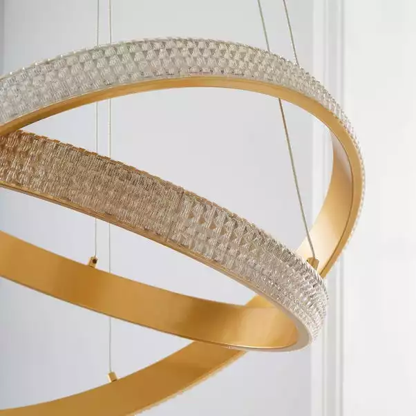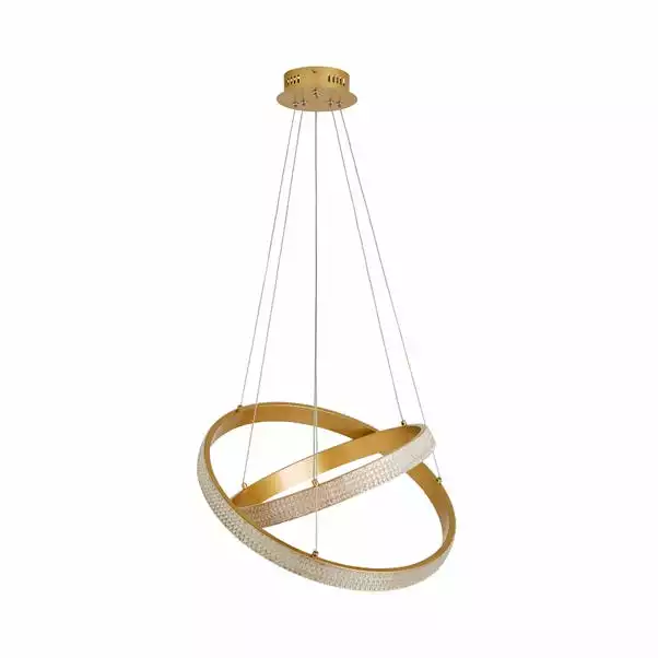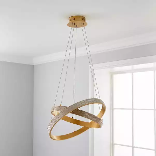 Add a glamorous touch to your home with the Hotel Harrogate 2 Light Ceiling Light. Featuring a suspended dual gold hoop with dual lit crystal effect LED integrated within the light, finished with a striking gold base and a height adjustable silver cable. The Hotel Harrogate Ceiling Light is the perfect piece to add a luxurious feel to your interior, pair with available matching family items to complete the look.
